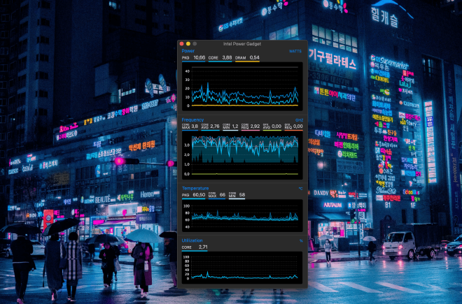 Intel Power Gadget is a neat tiny tool (Intel-made) that shows statistics about an Intel CPU and GPU. I can be useful to gain some insight on a system, and is also required for showing frequencies in iStat Menus.