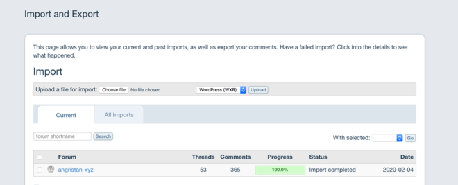 Once that was done, I created a new Disqus forum and imported the XML file. To see the import status and possible errors, I recommend going to import.disqus.com. To make sure I had a clean state after a few failures, I recreated the forum and imported the 100% valid XML file.