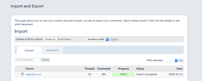 Once that was done, I created a new Disqus forum and imported the XML file. To see the import status and possible errors, I recommend going to import.disqus.com. To make sure I had a clean state after a few failures, I recreated the forum and imported the 100% valid XML file.