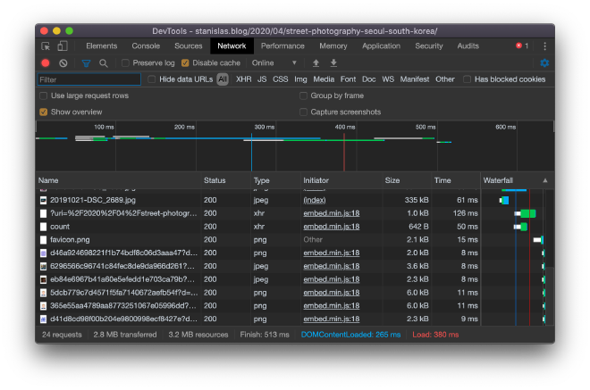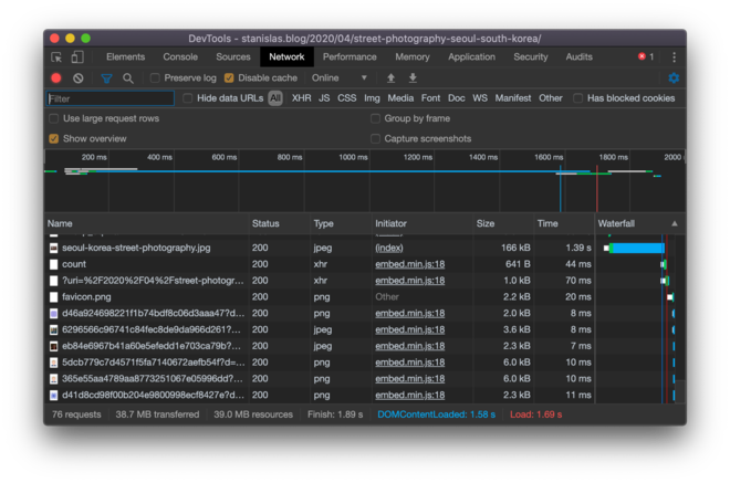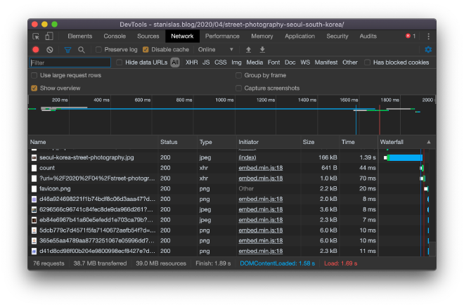 In my recent post about Street Photography in South Korea, I embedded many high-res pictures. The total size of the page is about 40 MB, which is a bit much to load right away.
