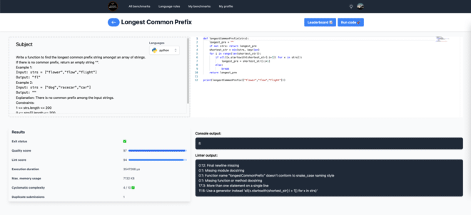 The service supports C++, Python, and Go and performs some code analysis on the submitted code.