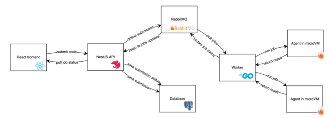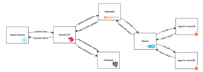 The main API is written with NestJS in TypeScript and contains all the features of the service. The code analysis is also done there. However, the code submissions are actually sent to a RabbitMQ queue and handled by workers and agents.