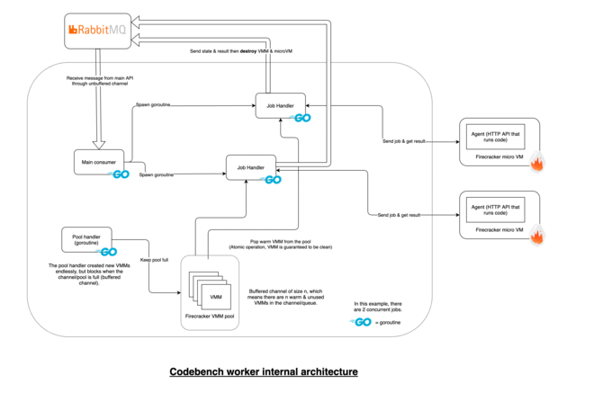 Also, under a high number of simultaneous code submissions, the worker would consume more microVMs that it is creating, even if it has resources available. An easy solution would be to launch multiple “pool handlers”, or to launch VMM creations in goroutines.