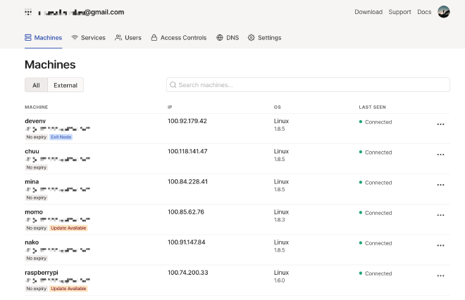 100.91.147.84 nako user.name@ linux active; direct [2001:bc8:xx:xx::1]:41641, tx 8220 rx 7956