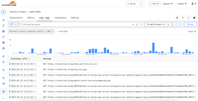 Now, the invocations of the worker are already logged (like: GET https://stanislas.blog/ - Ok @ 2/18/2025, 5:00:47 PM). But don’t contain much information.